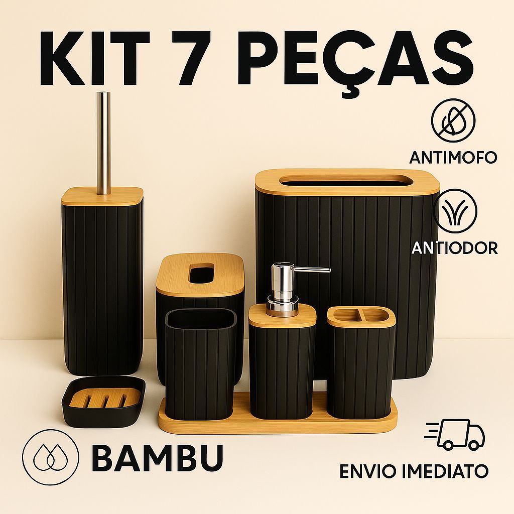 Kit 7 Peças Banheiro em Bambu Completo Lixeira Tampa Porta Escova Sanitária Acessórios Lavabo