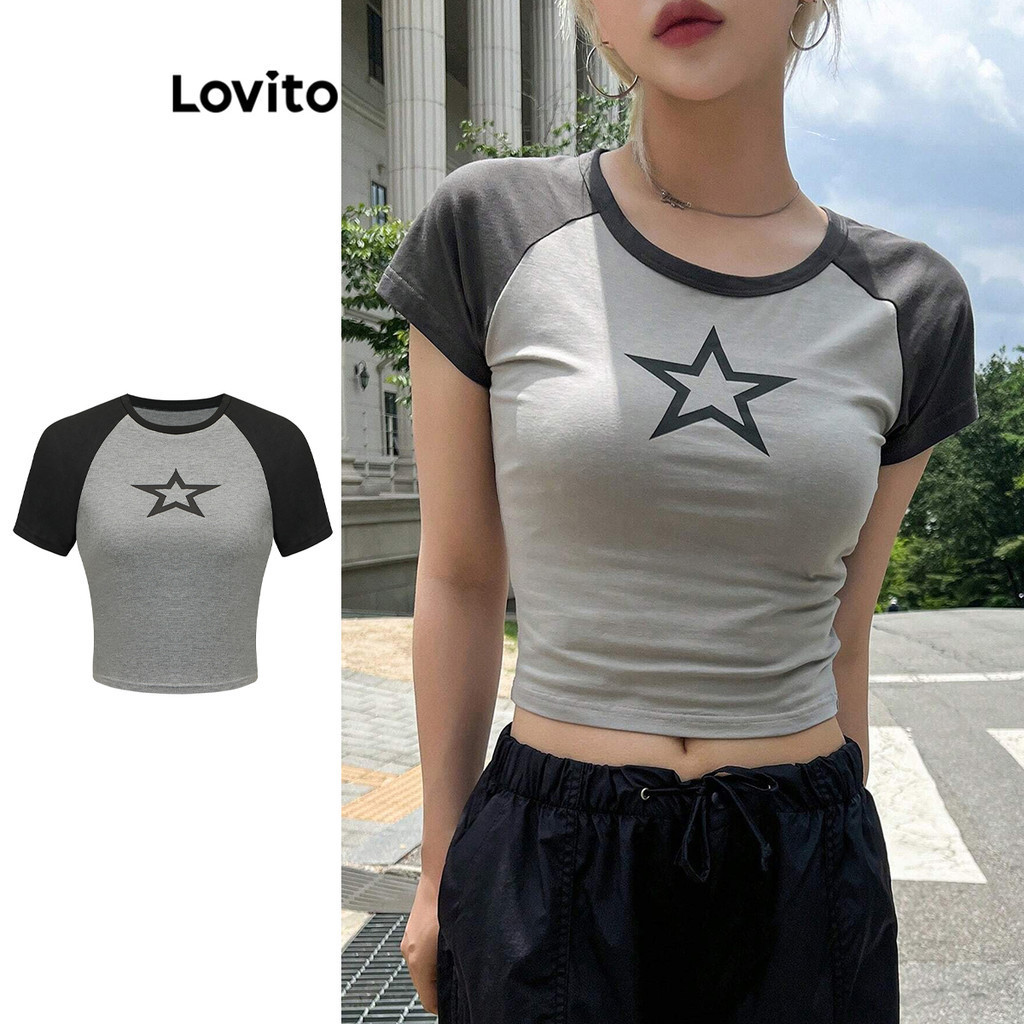 Lovito Camiseta Cropped Casual Geométrica de Bloco de Cores para Mulheres L80ED365
