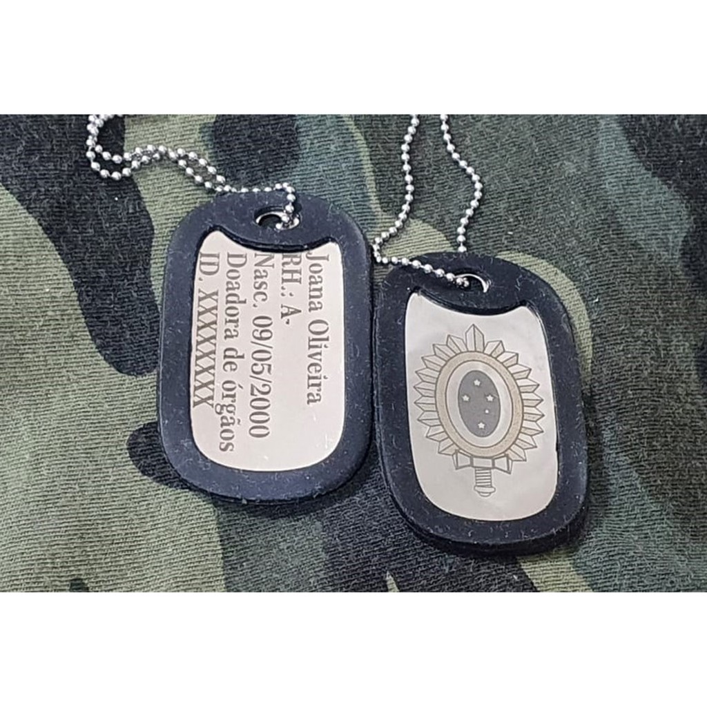 Placa inox personalizada tipo militar gravação a laser de simbolos e dados pessoais