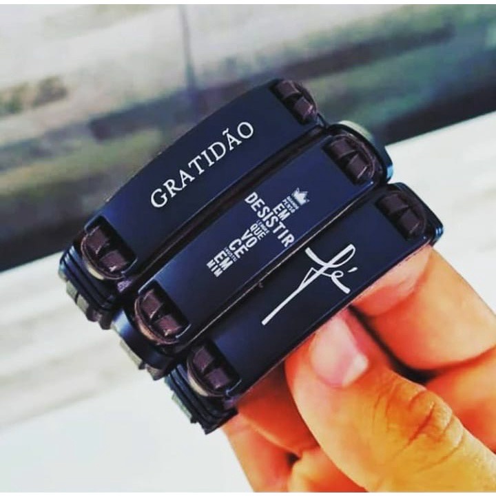 Pulseira Masculina de Couro Sintético com frases religiosas e fecho de aço cirurgico