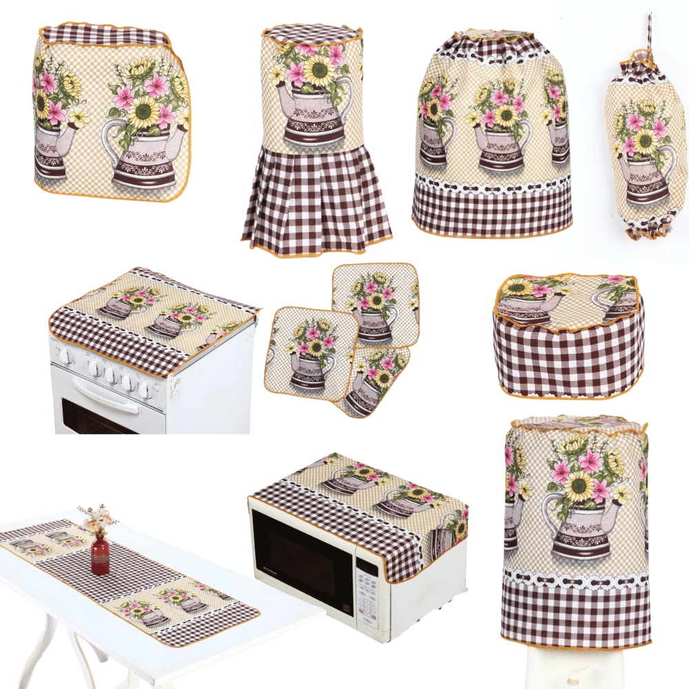 Kit Completo 14 Peças Estampado Caminho de Mesa/ Avental / Capa Botijão/ Capa Liquidificador / Fritadeira/ 03 Toalhas Multiuso Decoração Cozinha Oferta