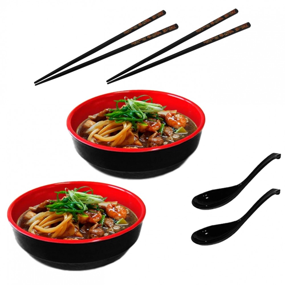 Kit para Sopa Japonesa com 2 Tigelas 450 Ml + 2 Colheres Melamina + 2 Pares de Hashi Preto