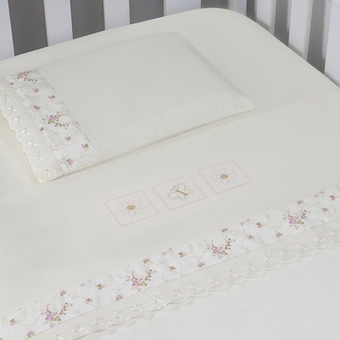 Jogo de Lençol para Berço Americano 3 pçs Bordado 100% Algodão Floral Rosa