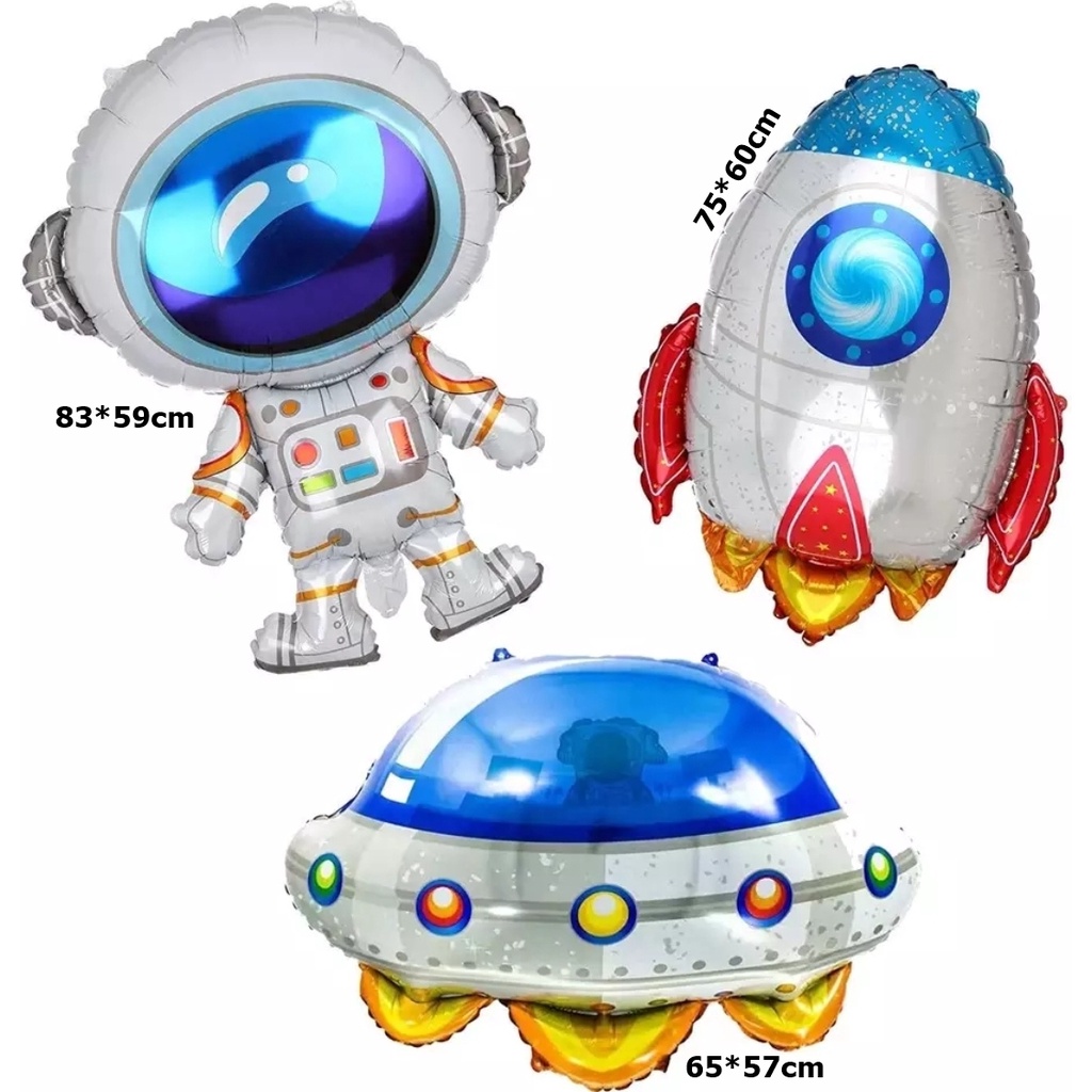 6 Balão Metalizado Astronauta 83cm Nave 65cm E Foguete Espacial 75cm - 2 Balões de Cada