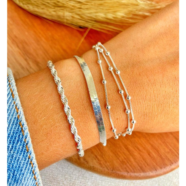 Kit Pulseira Feminina a Prata 925 Folheada de Bolinha Cordão Baiano Laminada Cobra