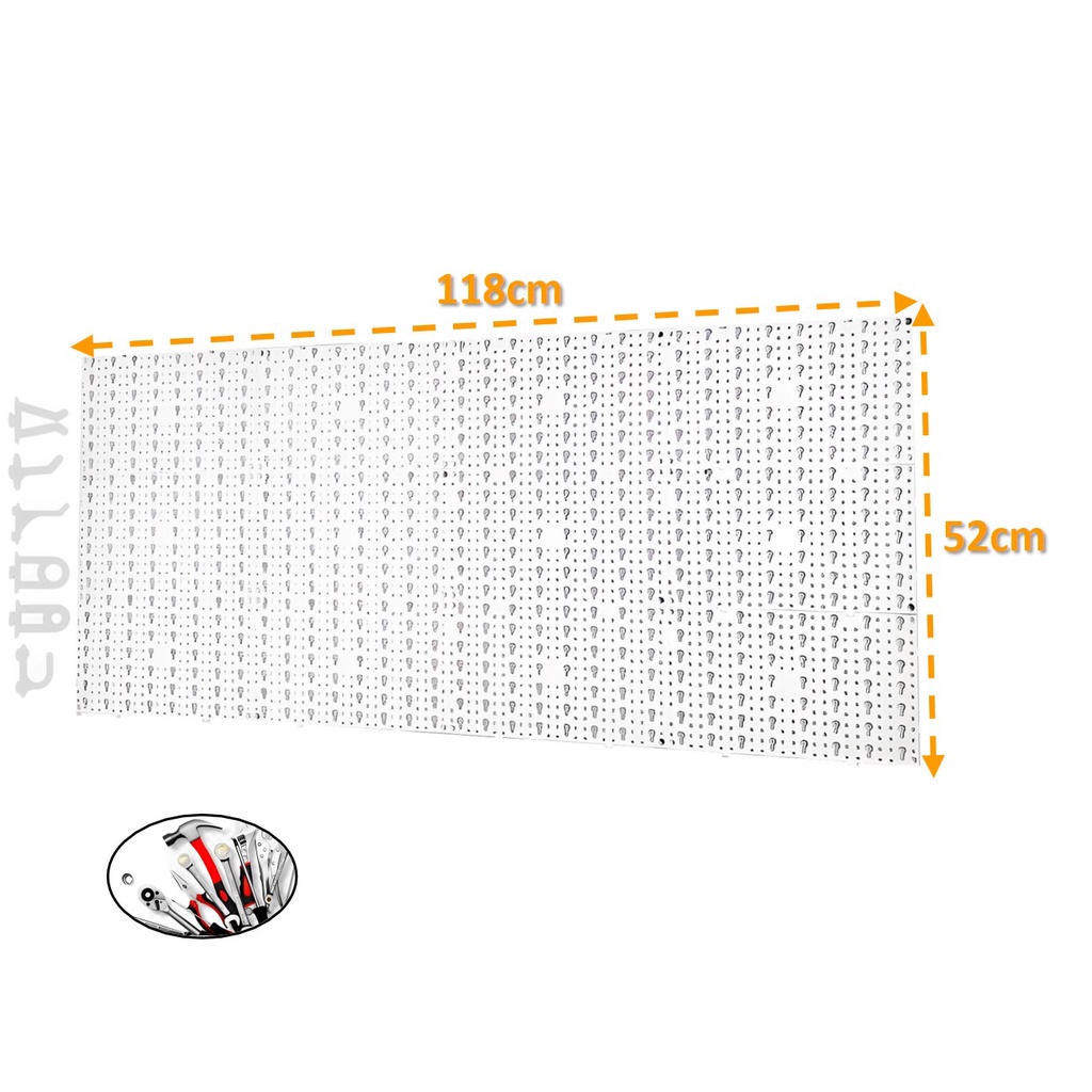 Painel Expositor De Ferramentas Modular 118cm x 52cm Em Plástico Perfurado Com 48 Ganchos Parede Branco - AMZ