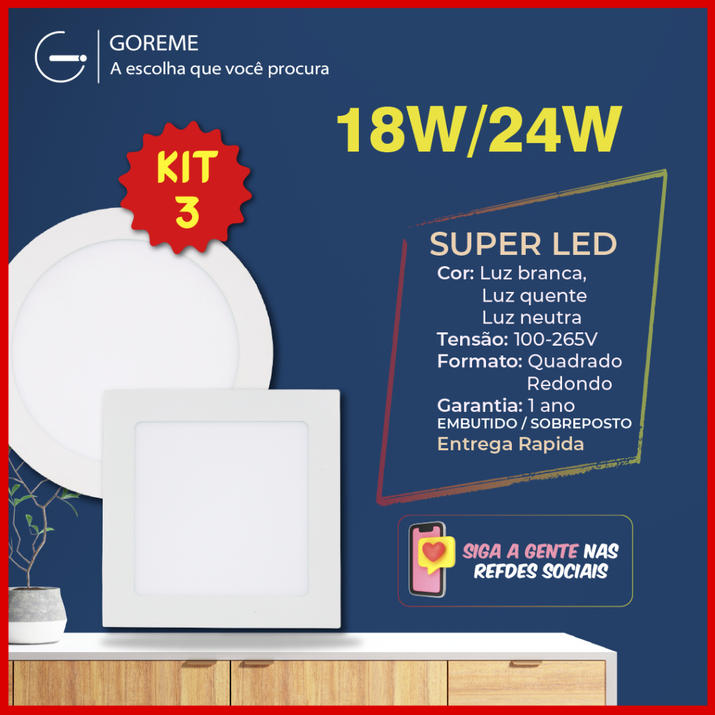 kit 3 un Painel led 12w/18w/ 24w Aluminio Plafon Quadrado luminaria Embutir/Sobrepor