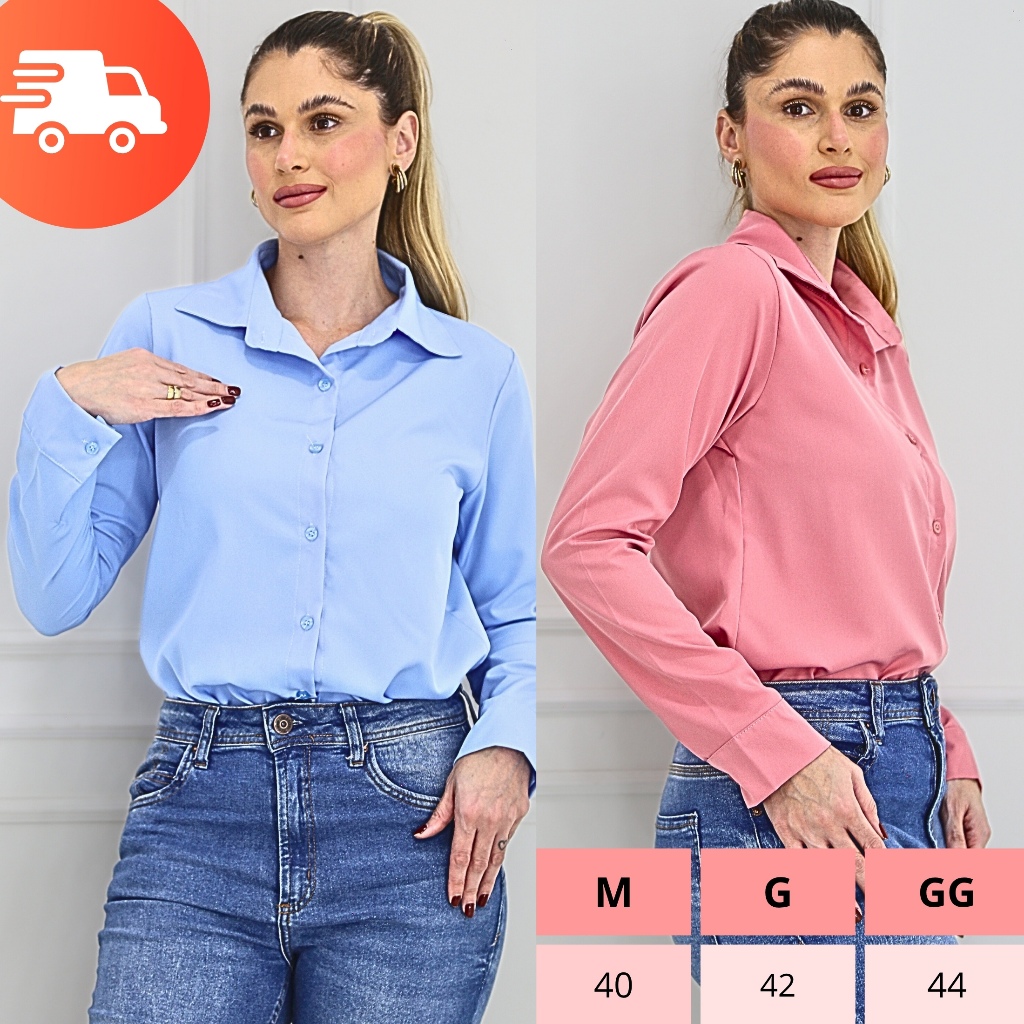 Camisa Feminina Social Blusa Casual Manga Longa Cores Lisas Trabalho Camisete Elegante Tecido Viscolinho com Elastano