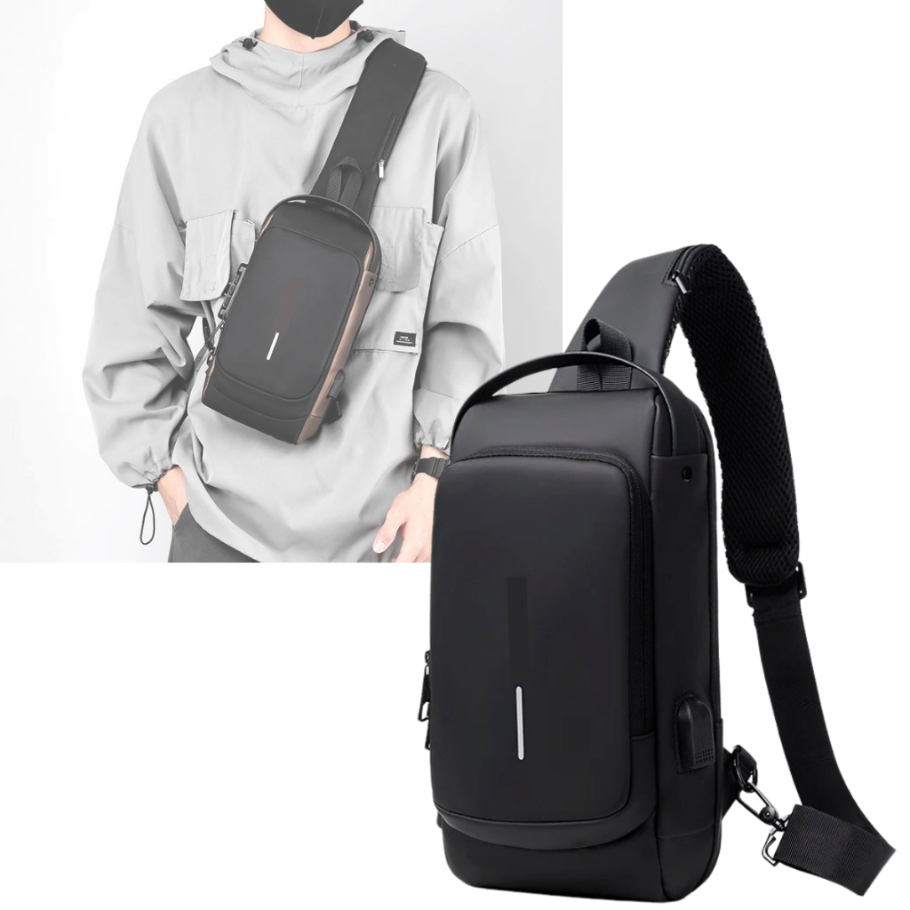 Mochila Bolsa Transversal Peito e Ombro Masculina Impermeável Anti Furto Com Senha Entrada USB