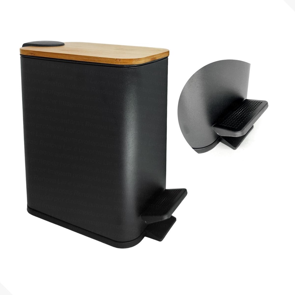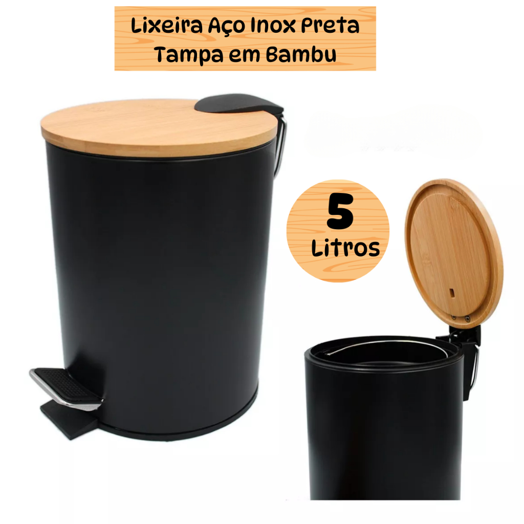 Lixeira Inox Preta Com Tampa de Bambu e Balde Removível 5 Litros Banheiro Cozinha Escritório Premium