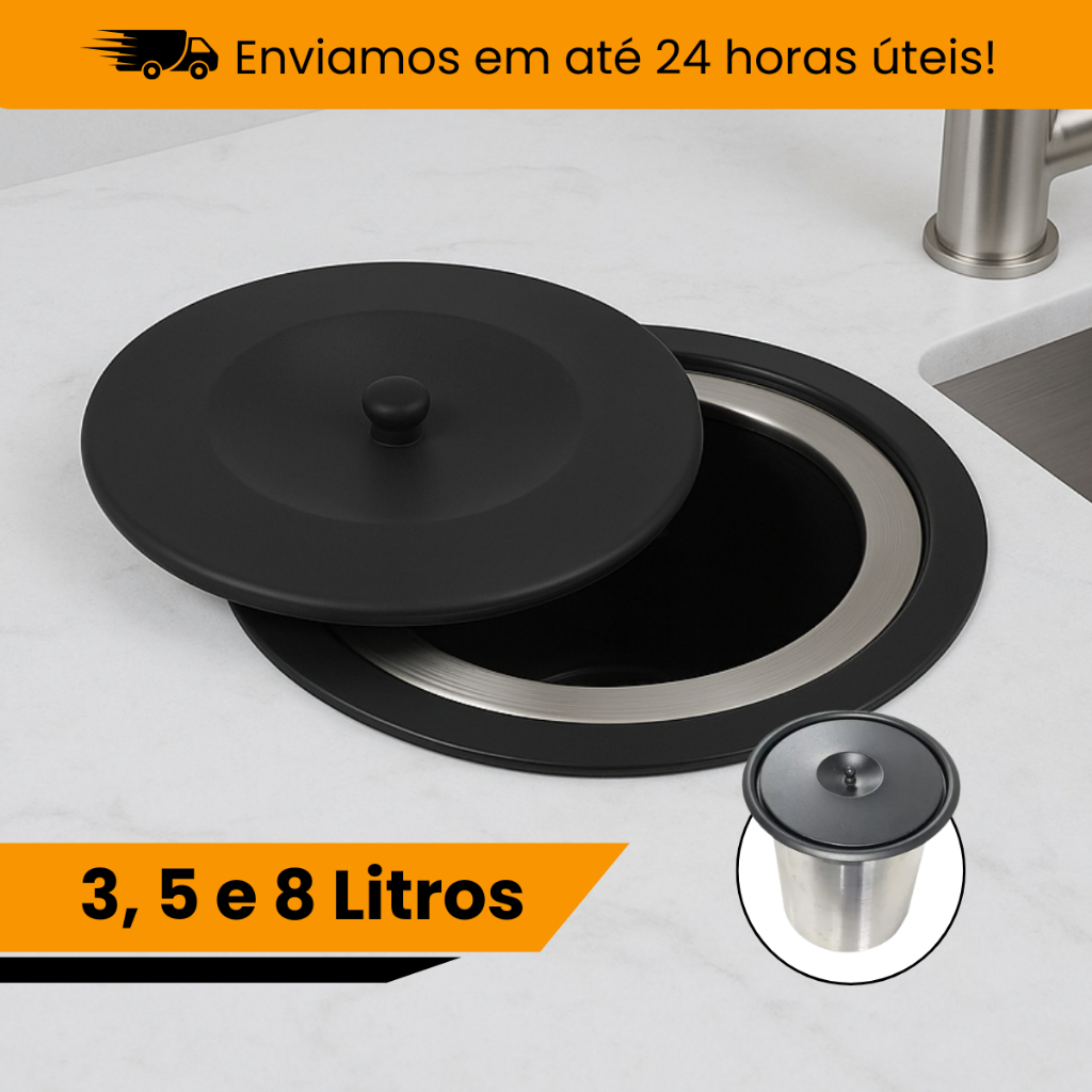 Lixeira de Embutir Inox com Tampa Preta – 3, 5 e 8 Litros para Cozinha e Pia Compacta Luxo Gourmet
