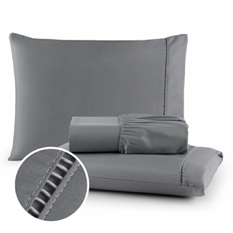 Jogo de Cama Lençol Percal 200 Fios 100% Algodão Bordado Liana Casal Padrão 04 Peças - Cinza