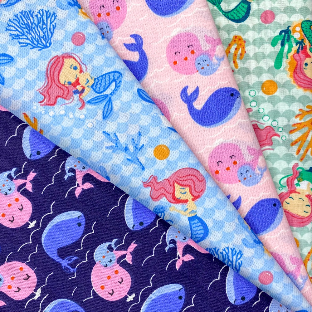 Tecido Tricoline Estampas Sereia e Baleia 50 cm x 1.50 metro - Patchwork / Artesanato 100% Algodão