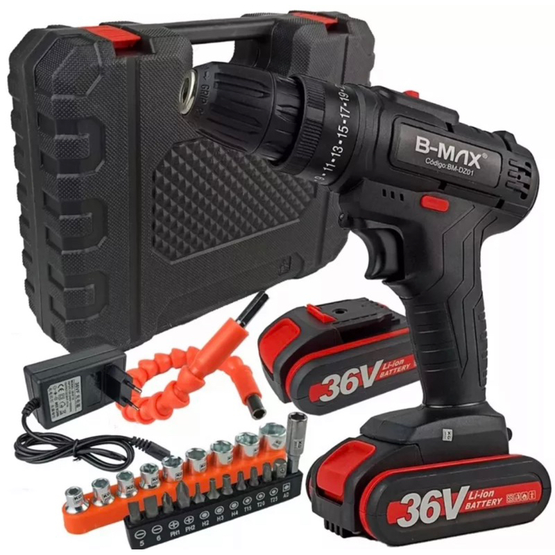 Furadeira e Parafusadeira Portátil com 2 baterias 36V + Kit Maleta com Acessórios - Bivolt
