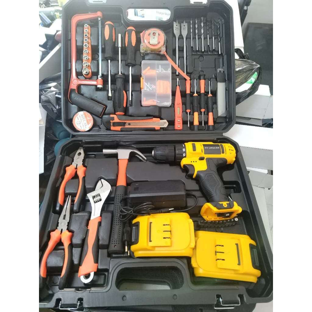 Kit de Ferramentas + Parafusadeira 21V 2 Baterias Furadeira Chave Martelo Fenda Catraca Maleta Completa 114 Pçs-LEGAL