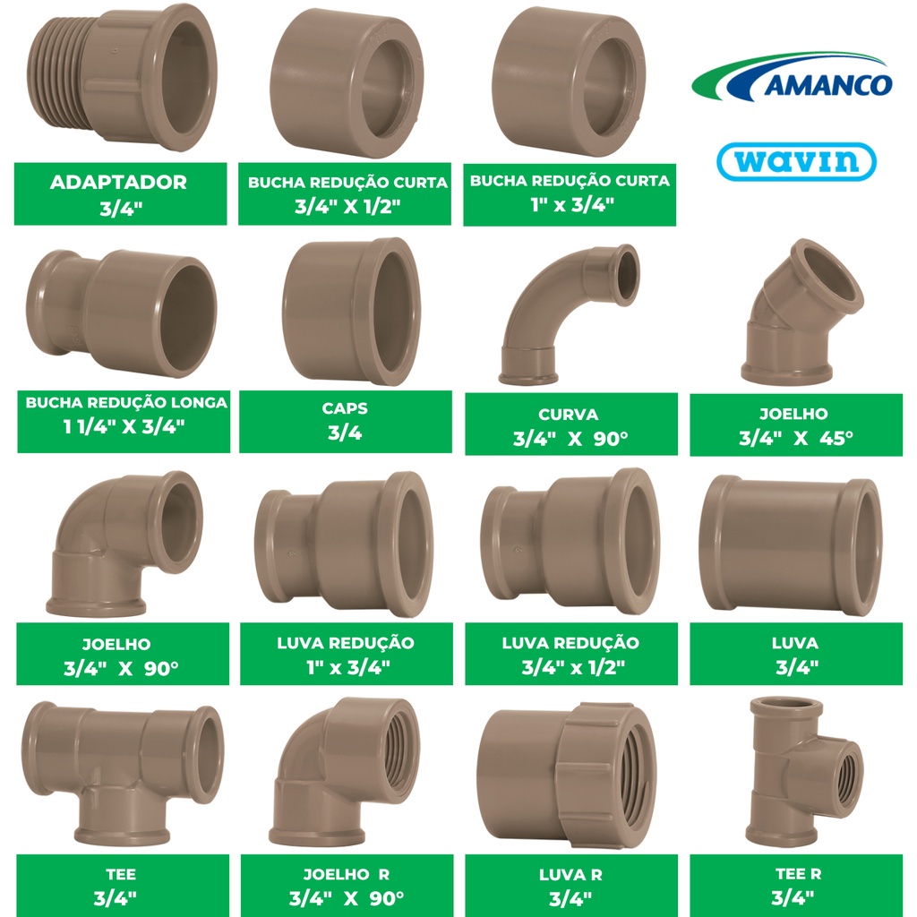 Amanco Wavin Kit Conexões de Água 3/4 ( MARROM / AZUL ) 25mm- Cotovelo - Luva - Tee - Curva 45 - Caps - Luva LR - Adaptador - Curva Longa - Flange - União