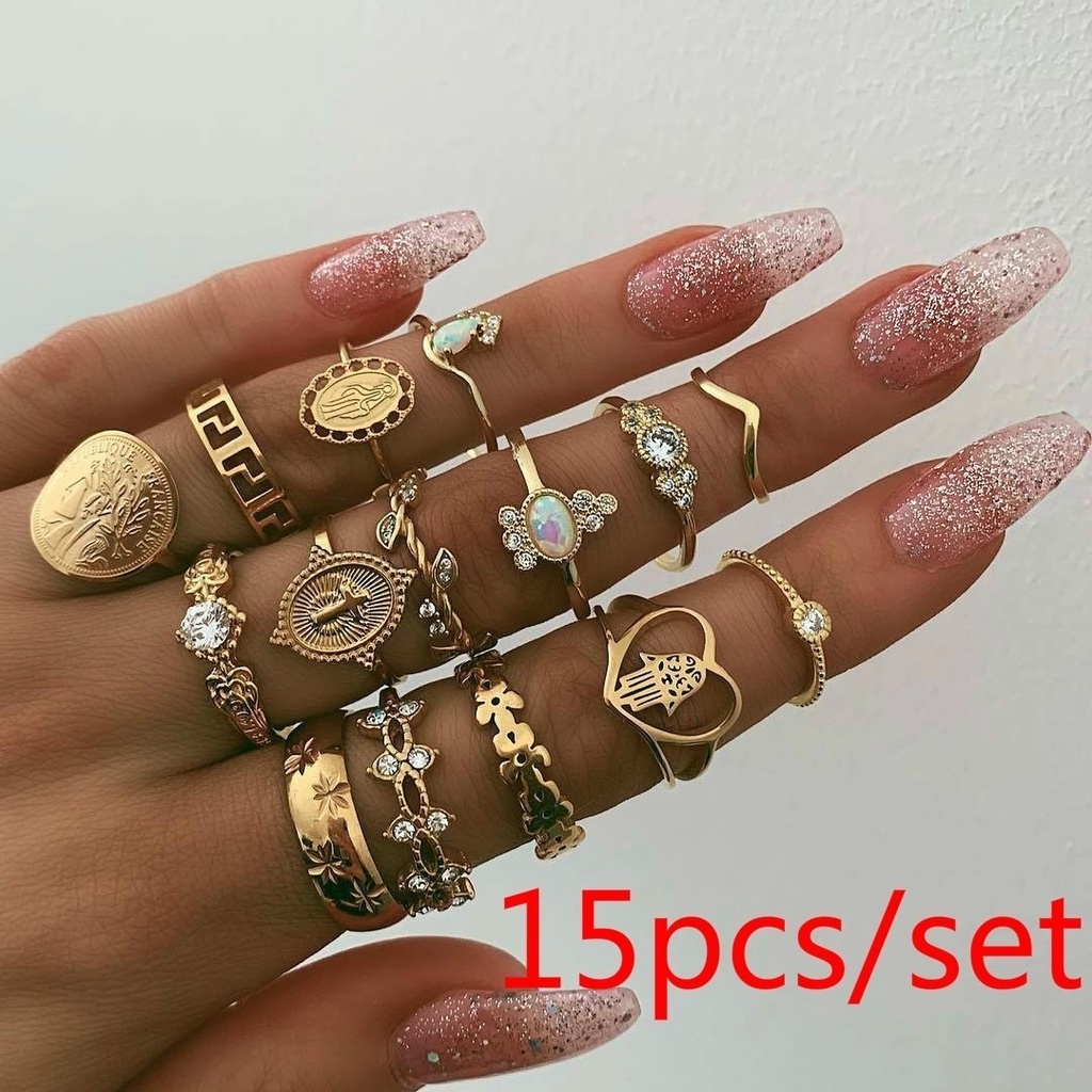 15 PCS/Set Retro Beauty Avatar Gold Coin Cross Ring Padrão De Anel De Palma De Amor Fatima Para Mulheres