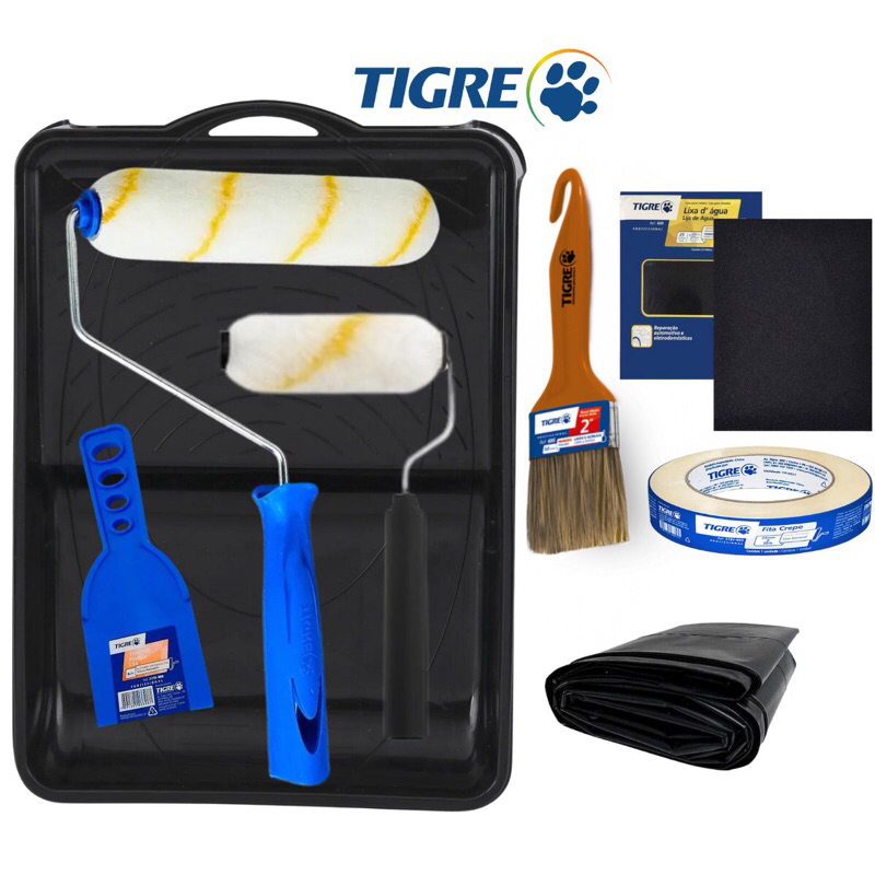 Kit Pintura Parede Completo Rolo Antirrespingo Bandeja Lixa Pincel Lona Fita Crepe Espatula Rolinho anti respingo 10 Pçs Tigre