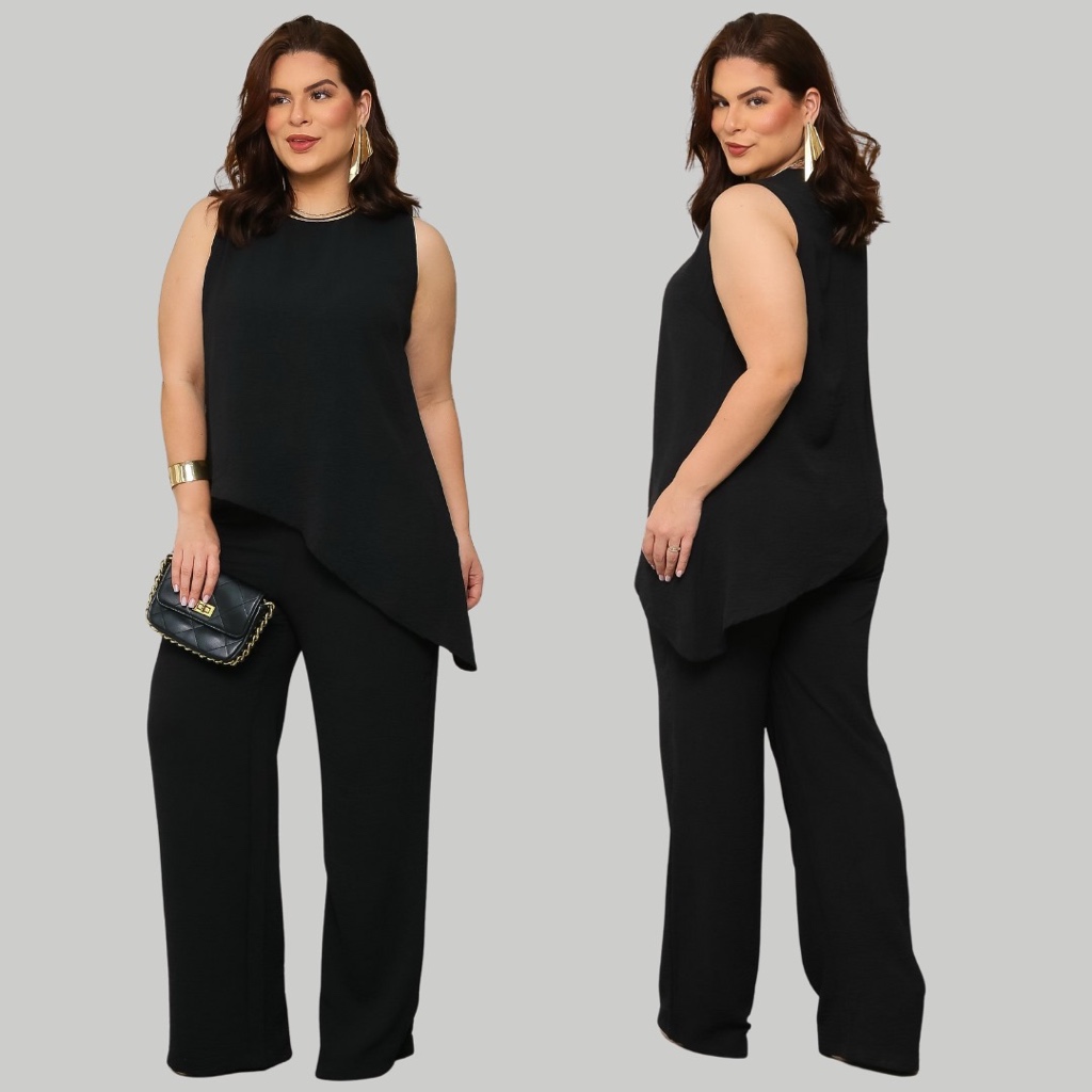 Conjunto Feminino Plus Size 2 Peças Blusa Regata Com Bainha Assimétrica e Calça Pantalona Reta Bolso