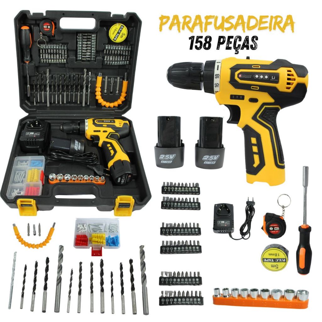 Parafusadeira Furadeira Sem Fio Com 158 Pcs 25v 2 Baterias