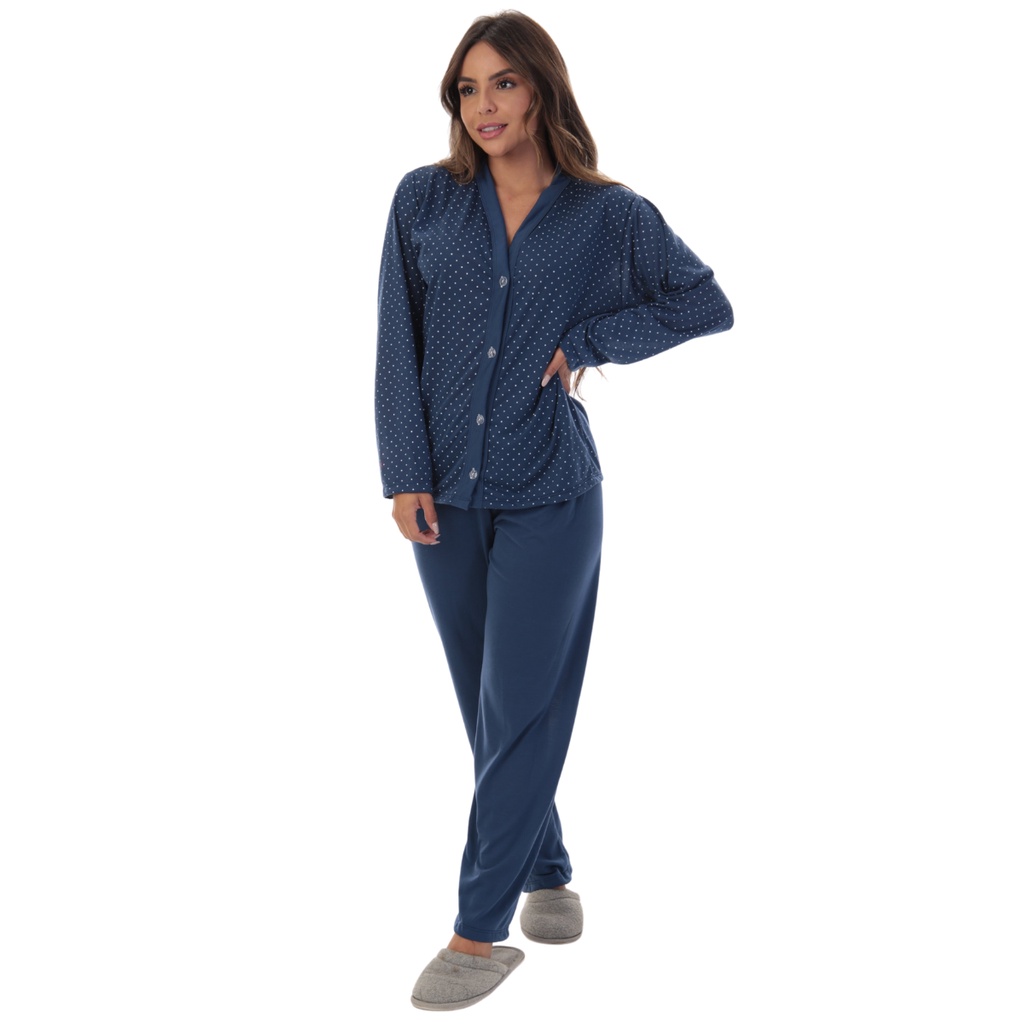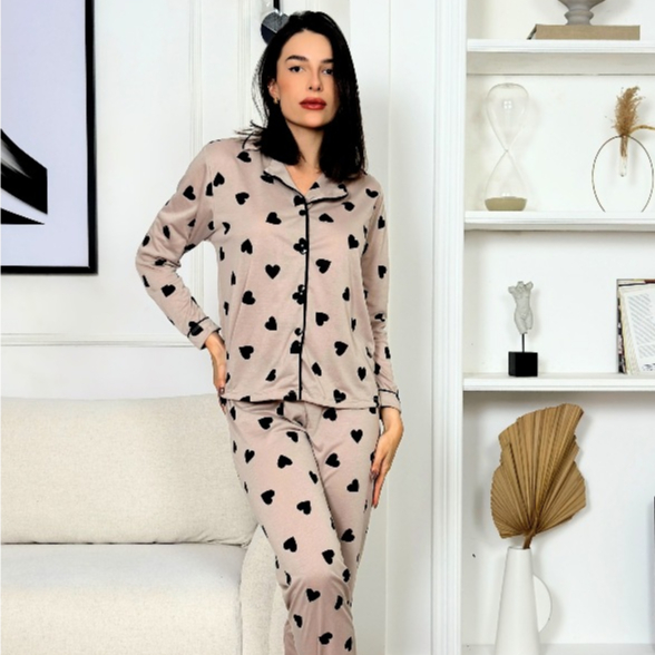Pijama Longo de Botão Malha Estampado Adulto Barato Feminino Inverno Manga Longa Roupa Feminina