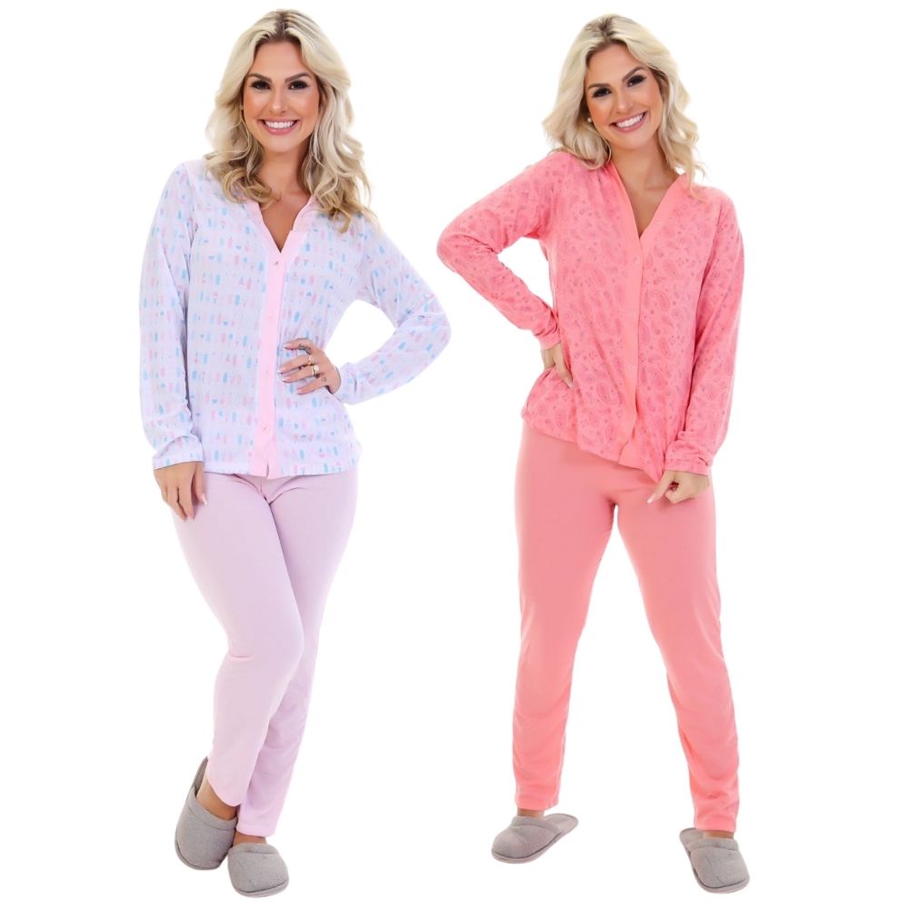 Pijama longo americano Feminino de Frio calça e blusa manga longa botão gestante amamentação inverno