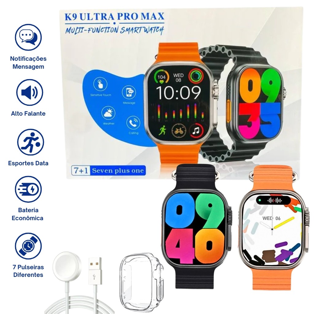 SmartWatch K9 Ultra Pro Max Seri 10 Tela 2.2 HD 49mm com 7 Pulseiras Prova D'Agua IP67 FereFit