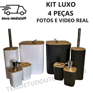 Kit Banheiro Lixeira Bambu Luxo Conjuto Lavabo Saboneteira de Banheiro e Escova Sanitaria 4 peças