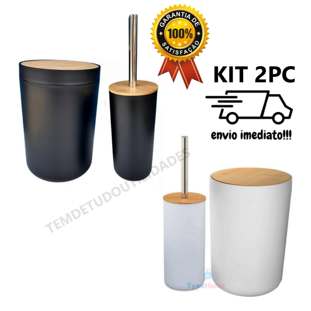 Kit pra Banheiro Bambu 2 Pçs Lixeira Escova Conjuto Lavabo de Vaso Preto ou Branco