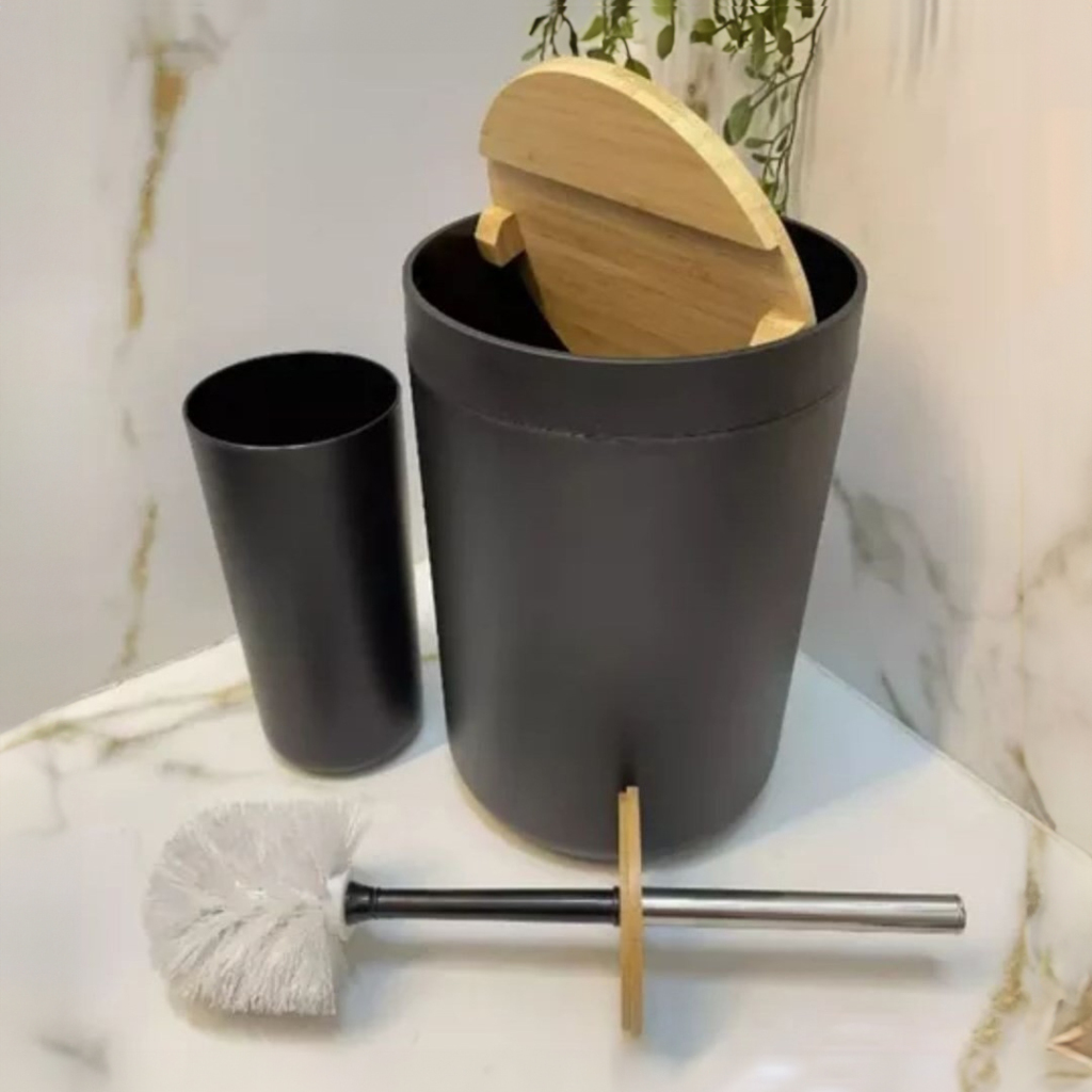 Kit pra Banheiro Bambu 2 Pçs Lixeira Escova Conjuto Lavabo de Vaso Preto ou Branco Cinza