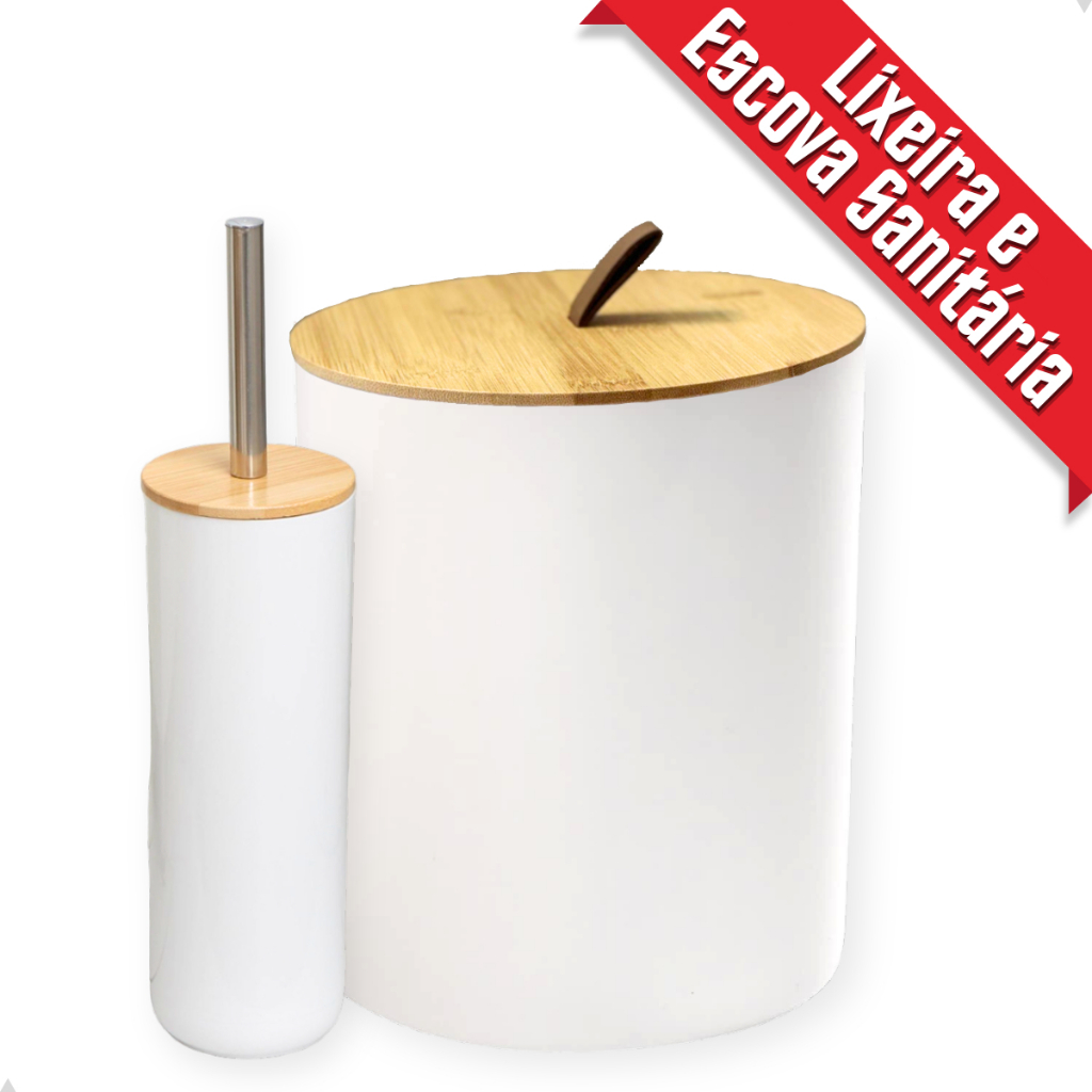 Lixeira e Escova Sanitária Kit Acessórios 2 Pçs Banheiro Lavabo Bambu Branco Premium Basculante