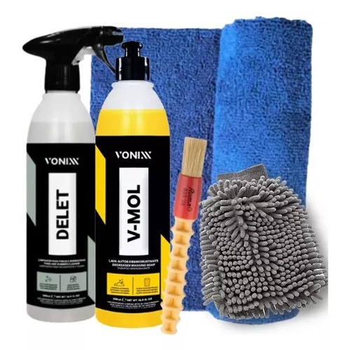 Kit Limpeza Lavagem Automotiva Limpador de Plasticos Borrachas Shampoo Desengraxante Neutro Descontaminante Ferroso Delet Izer V-mol 500ml Vonixx
