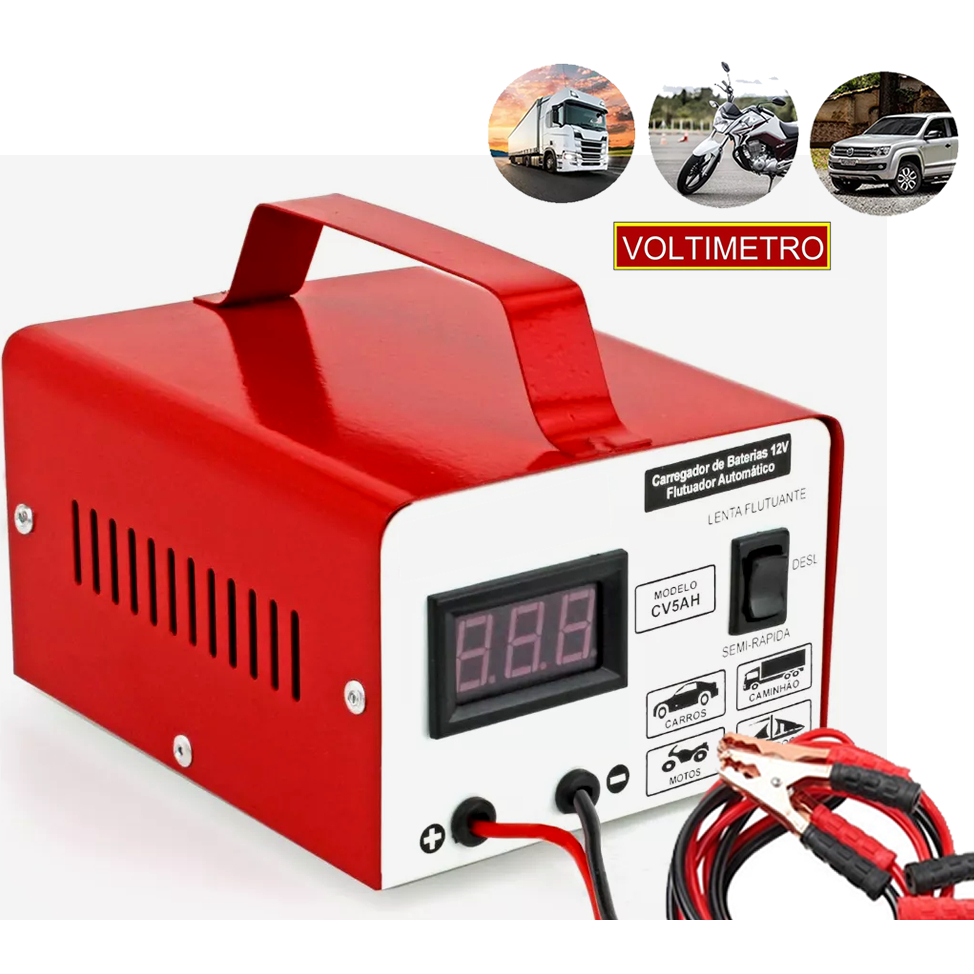 Carregador de Bateria 12v Inteligente c/ Voltimetro Até 300amperes Carro moto caminhao 5Ah