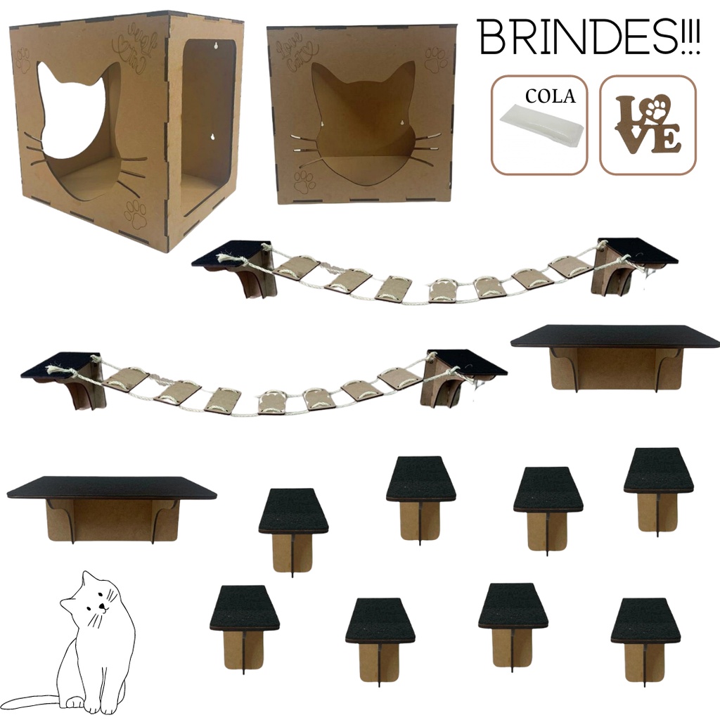 Kit Playground para Gatos Parede Diversão Gatinho Pet Mdf 4mm Degraus Ponte Nicho Cama Descanso