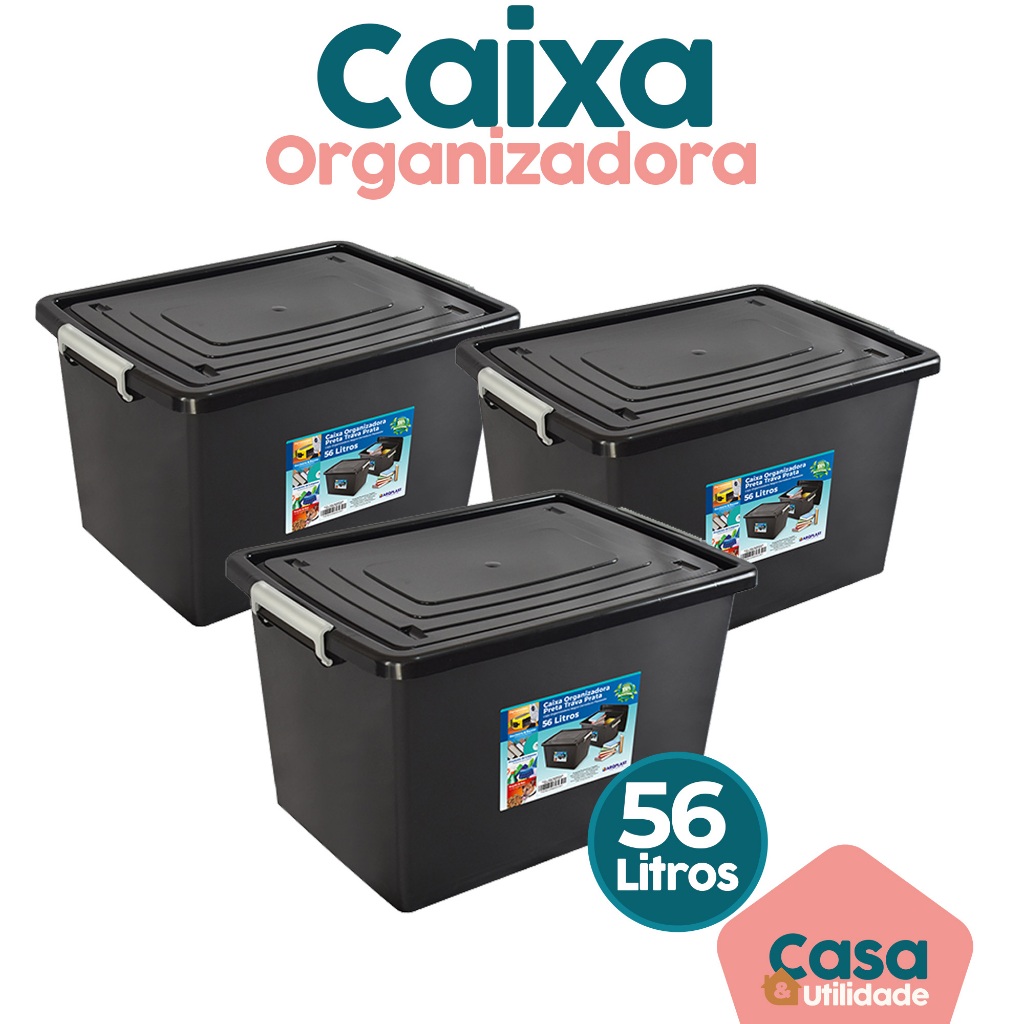 Kit Caixa Organizadora Preta 56 Litros Com Travas e Tampa Arqplast