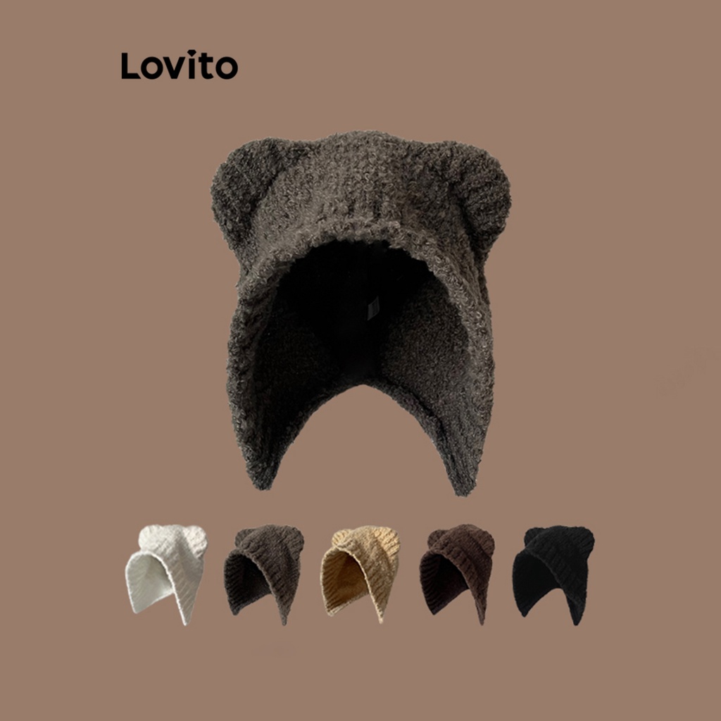 Lovito Fofo Chapéu Feminino de Desenho com Orelhas de Urso de Pelúcia Quente LFA08595 (Cinza/Branco/Preto)