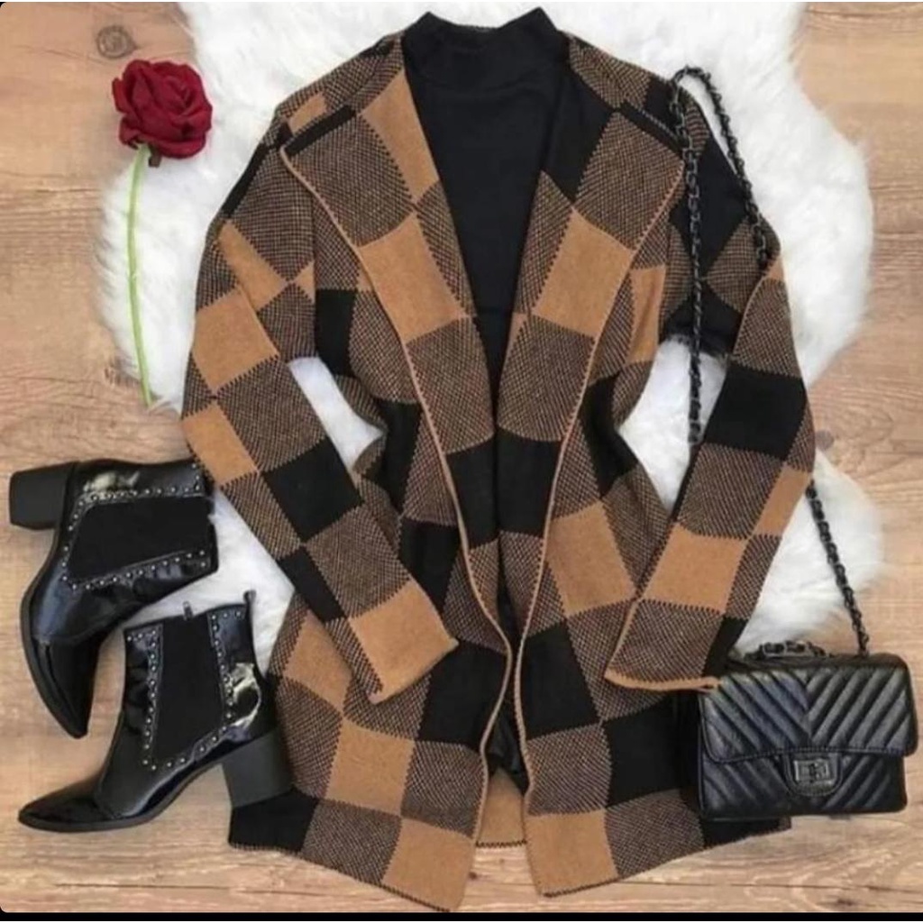 Casaco Xadrez Cardigan Sobretudo Tricô Moda Inverno Feminino