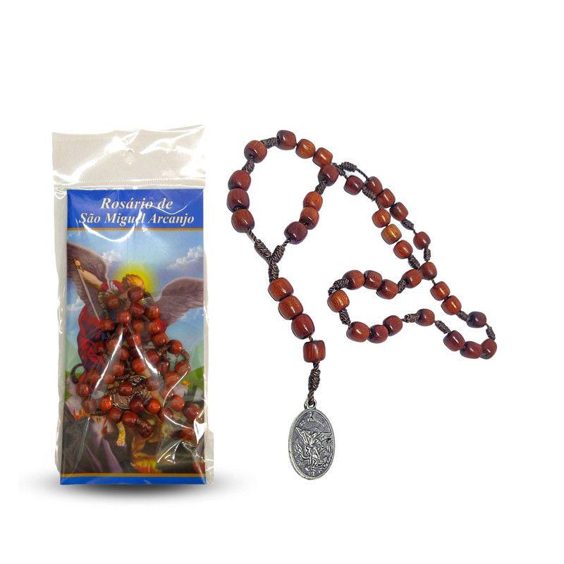 Terço São Miguel, Terço de Madeira São Miguel Arcanjo, Medalha Resinada e Crucifixo em Metal