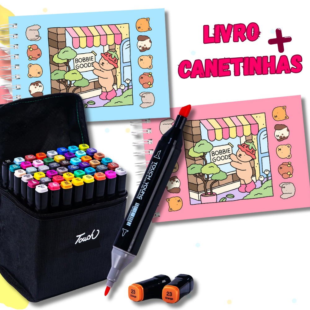 Livro Bobbie Goods para colorir Capa dura e Kit canetinha coloridas 48 60 80