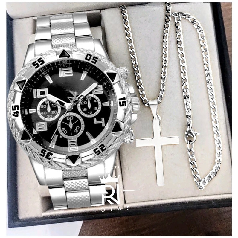 Conjunto relógio + corrente Pingente cruz e pulseira masculino Aço inox Prateado