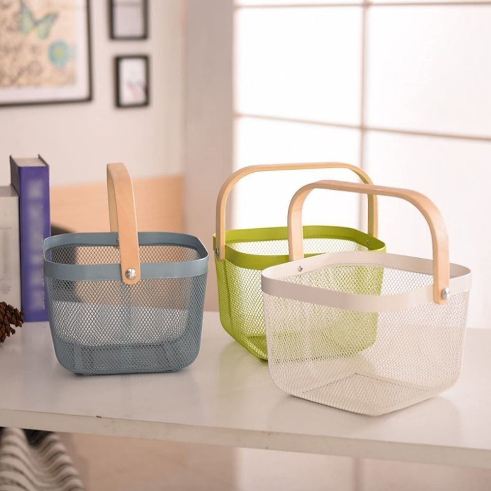 Cesta de armazenamento de arame redonda de metal, cesta organizadora de armazenamento de aço de malha com alça de bambu, cesto multifuncional para cozinha, banheiro, piquenique, decoração de compras, armário, casa
