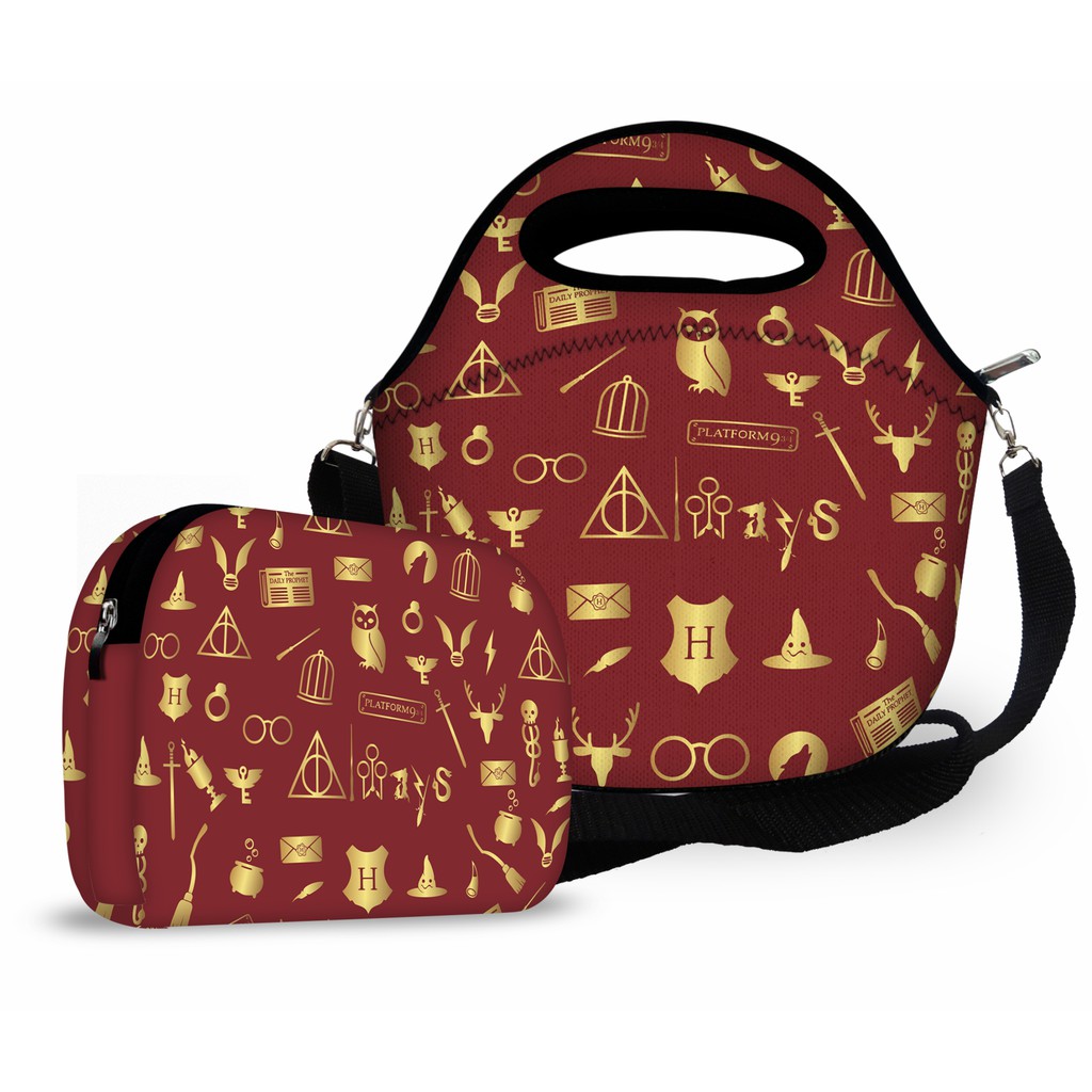 Kit Lancheira e Nécessaire Feminina Térmica Neoprene Bolsa com Alça Lancheira Nécessaire Feminina - Harry Potter - Mundo Bruxo
