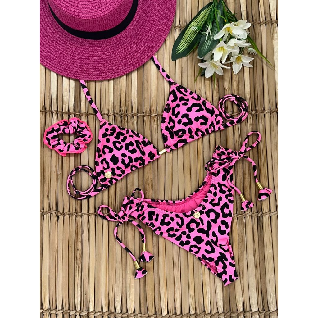Biquíni Adulto Cortininha Com Bojo Removível Calcinha Fio Duplo Asa Delta Onça Rosa