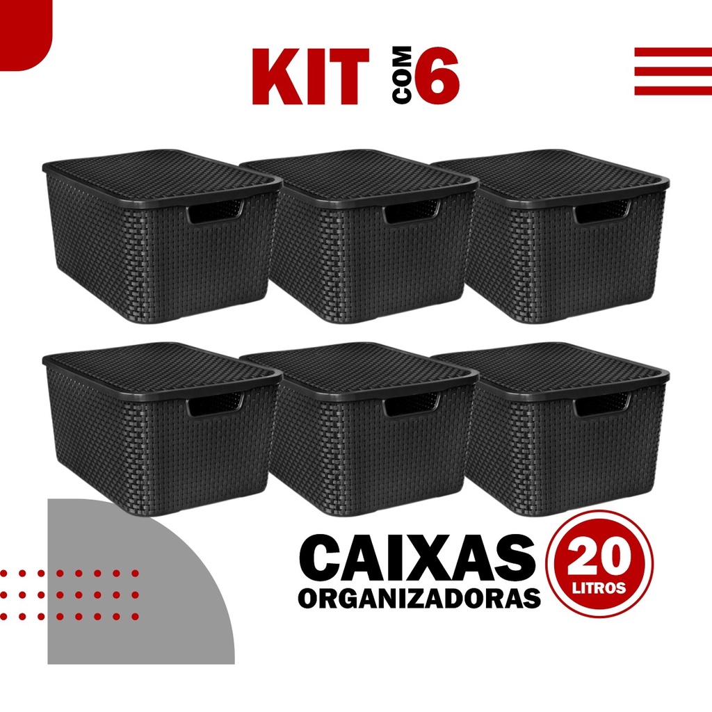 Kit 6 Caixa Organizadora Rattan 20 Litros Com Tampa Brinquedos Armários Guarda-roupa Ferramentas