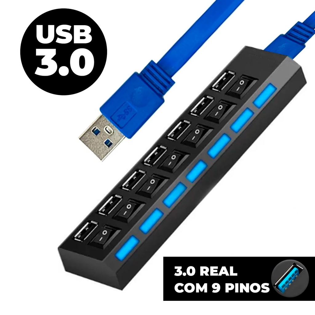 Régua Hub USB Com 7 Entradas 3.0 480mbps Excelente Taxa de Transferência Conecta Diversos Aparelhos Mouse, Impressora, HD Exerno, Teclado
