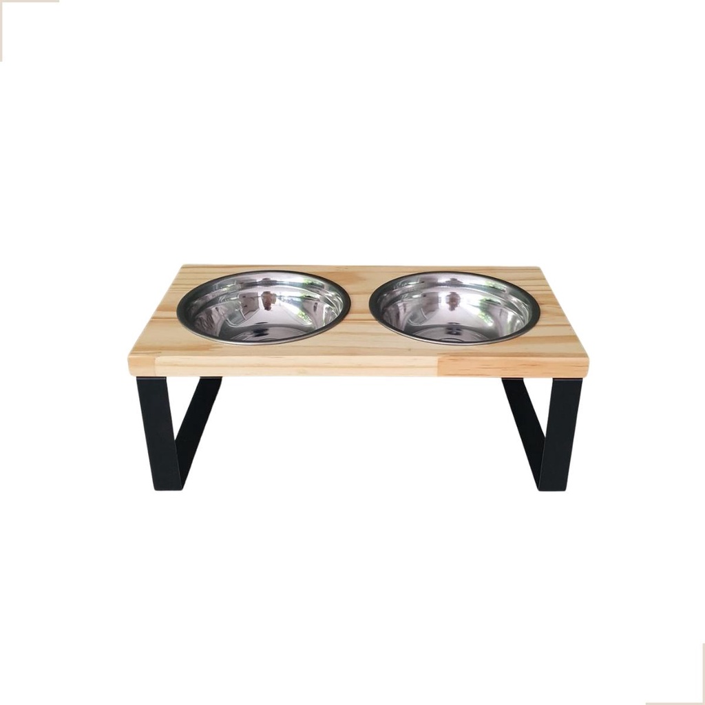 Comedouro elevado duplo P madeira e inox gato e cachorro