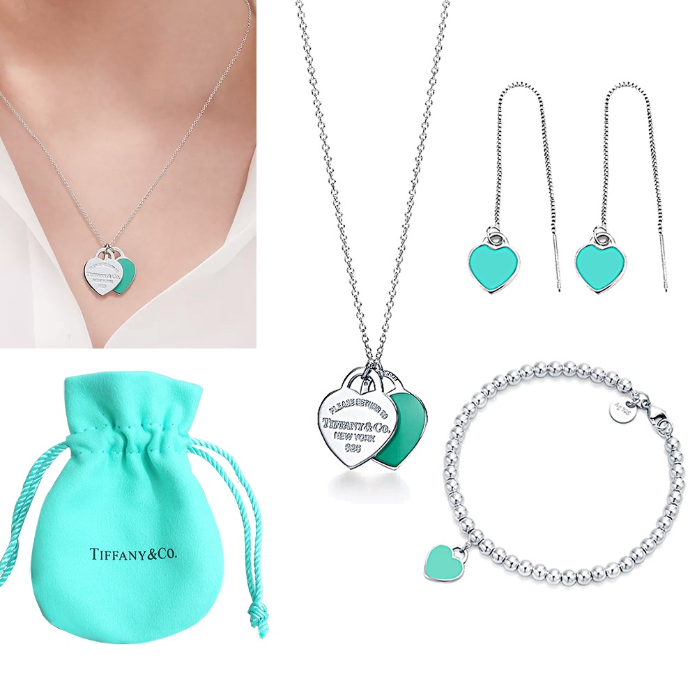 Conjunto TFNY Colar Pulseira 925 Brincos Prata Pingentes Coração Azul Com Bolsa De Veludo