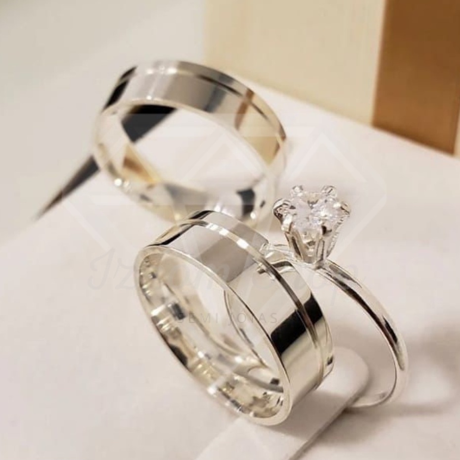 Par de Aliança Prata Fina Lisa Polida Clássica de Namoro/Compromisso/Noivado + Anel Solitário