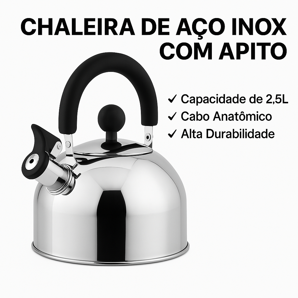 Chaleira com Apito 2,5 Litros em Aço Inox – Praticidade, Elegância e Durabilidade para Sua Cozinha
