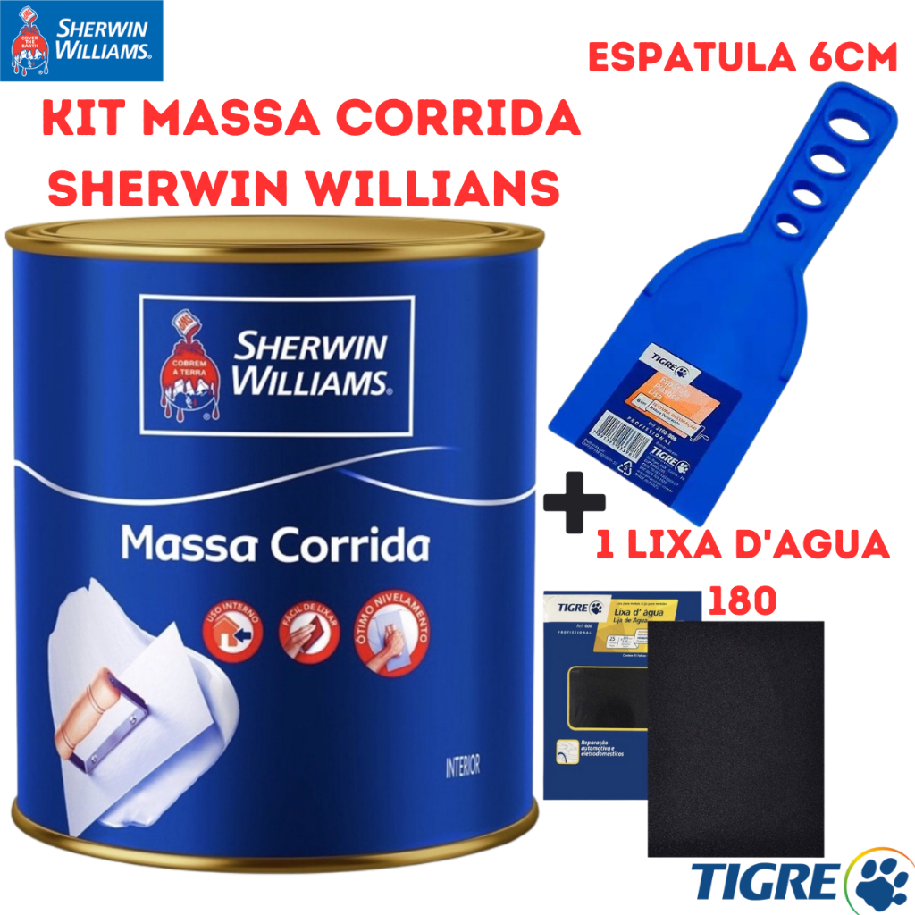 Massa Corrida Sherwin Willians 900ml Branca Kit C/ 1 Lixa D'AGUA 180 1 Espátula Plástica 6CM Uso Interno